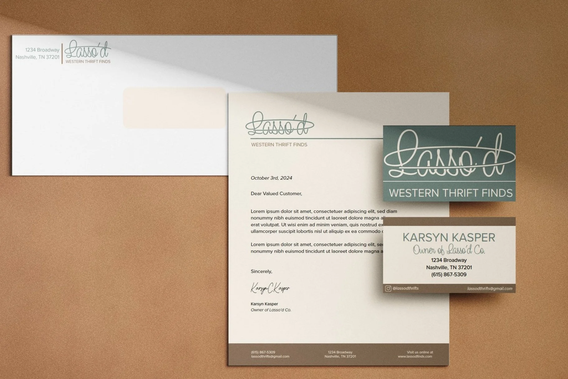 The wordmark was then applied across a branded stationery system, including a letterhead, envelope, and a two-sided business card. The final result is a cohesive identity that uses type to communicate both brand personality and visual style.